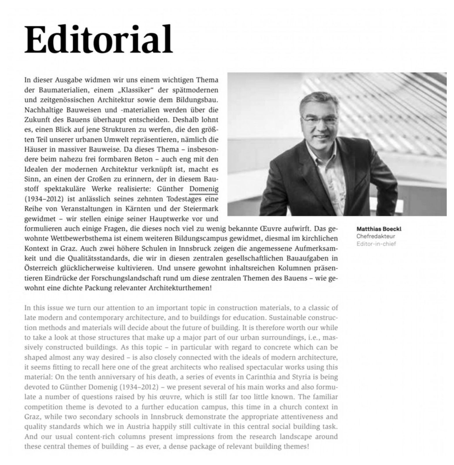 In dieser Ausgabe widmen wir uns einem wichtigen Thema der Baumaterialien, einem „Klassiker" der spätmodernen und zeitgenössischen Architektur sowie dem Bildungsbau. Nachhaltige Bauweisen und -materialien werden über die Zukunft des Bauens überhaupt entscheiden. Deshalb lohnt es, einen Blick auf jene Strukturen zu werfen, die den größten Teil unserer urbanen Umwelt repräsentieren, nämlich die Häuser in massiver Bauweise. Da dieses Thema - insbesondere beim nahezu frei formbaren Beton - auch eng mit den Idealen der modernen Architektur verknüpft ist, macht es Sinn, an einen der Großen zu erinnern, der in diesem Baustoff spektakuläre Werke realisierte: Günther Domenig (1934-2012) ist anlässlich seines zehnten Todestages eine Reihe von Veranstaltungen in Kärnten und der Steiermark gewidmet - wir stellen einige seiner Hauptwerke vor und formulieren auch einige Fragen, die dieses noch viel zu wenig bekannte Ceuvre aufwirft. Das gewohnte Wettbewerbsthema ist einem weiteren Bildungscampus gewidmet, diesmal im kirchlichen Kontext in Graz. Auch zwei höhere Schulen in Innsbruck zeigen die angemessene Aufmerksamkeit und die Qualitätsstandards, die wir in diesen zentralen gesellschaftlichen Bauaufgaben in Österreich glücklicherweise kultivieren. Und unsere gewohnt inhaltsreichen Kolumnen präsentieren Eindrücke der Forschungslandschaft rund um diese zentralen Themen des Bauens - wie gewohnt eine dichte Packung relevanter Architekturthemen!
