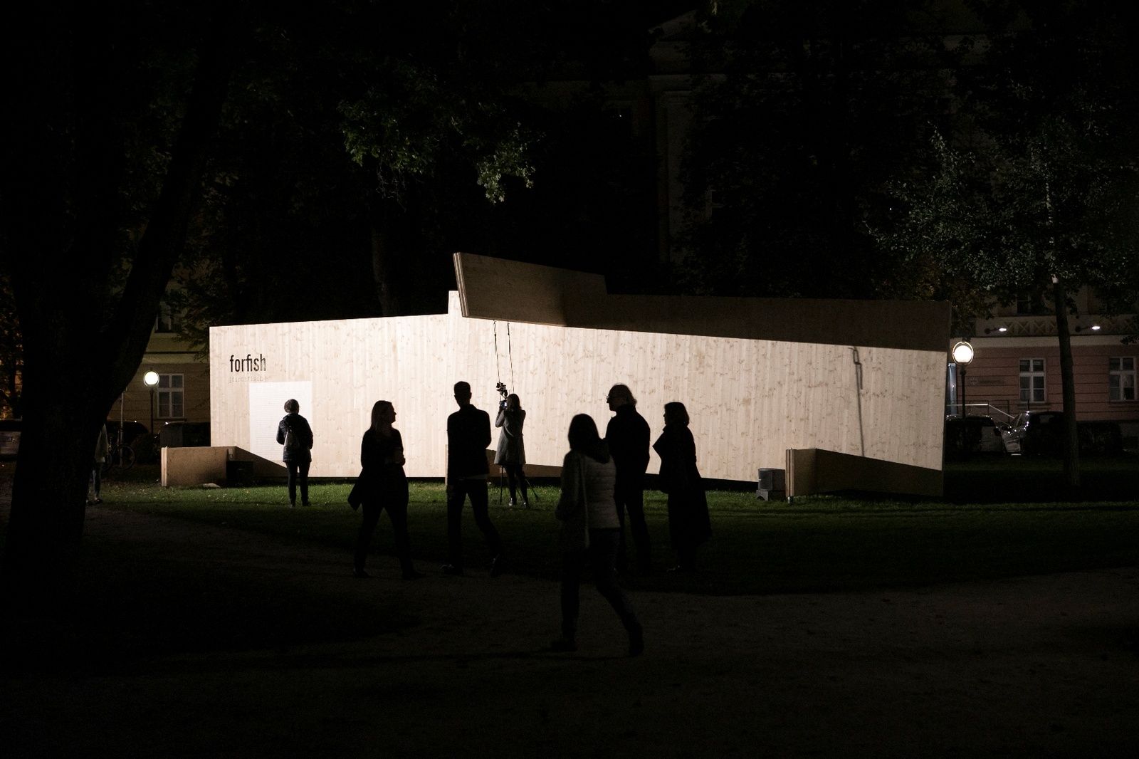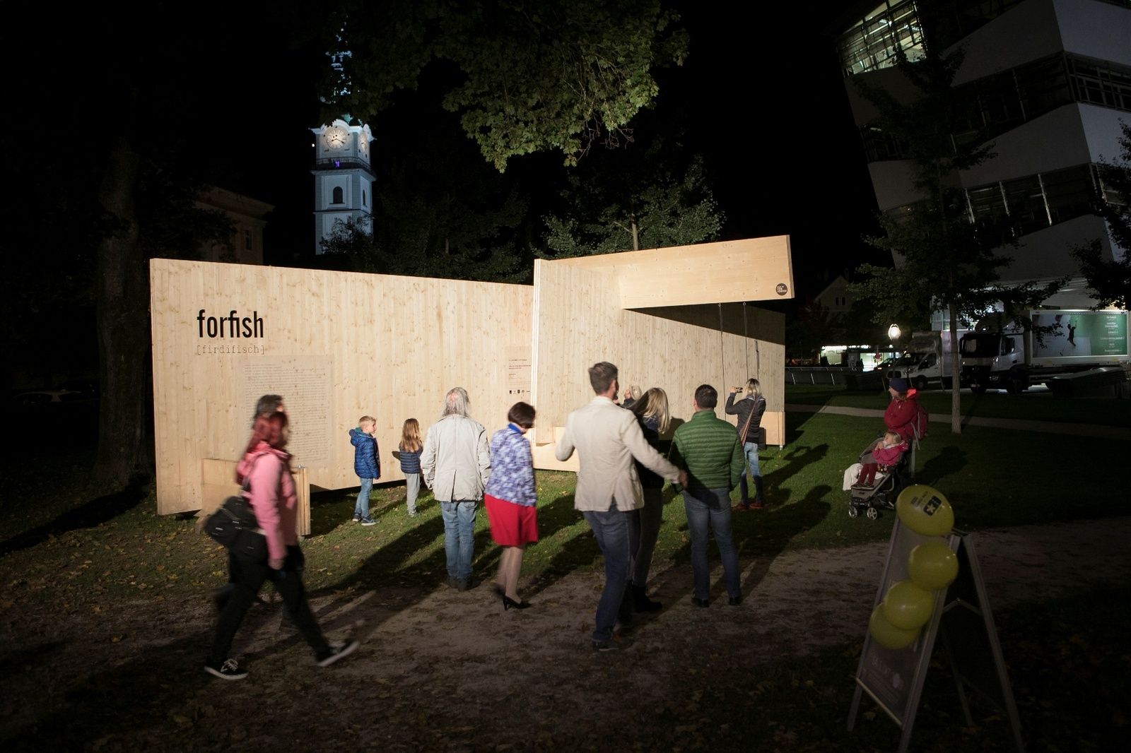 Um die 800 BesucherInnen bewegten sich während der ORF Langen Nacht der Museen zwischen der Installation FOR FISH und der Ausstellung vom Holzbaupreis Kärnten 2019. Die Installation der beiden Holzplatten wurde mit einer szenischen Lesung zum Leben erweckt. Der Schauspieler und Performance Künstler Rudolf Widerhofer las die Geschichte vom Fritz und vom Fisch in unterschiedlichen Facetten. Sitzend im Wasser vom Goetheparkbrunnen stellte er eine Verbindung zwischen dem Wasser und der Installation her.