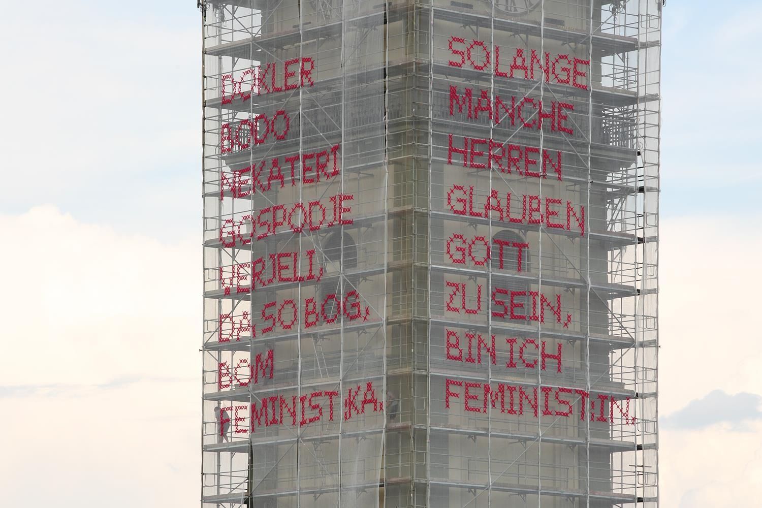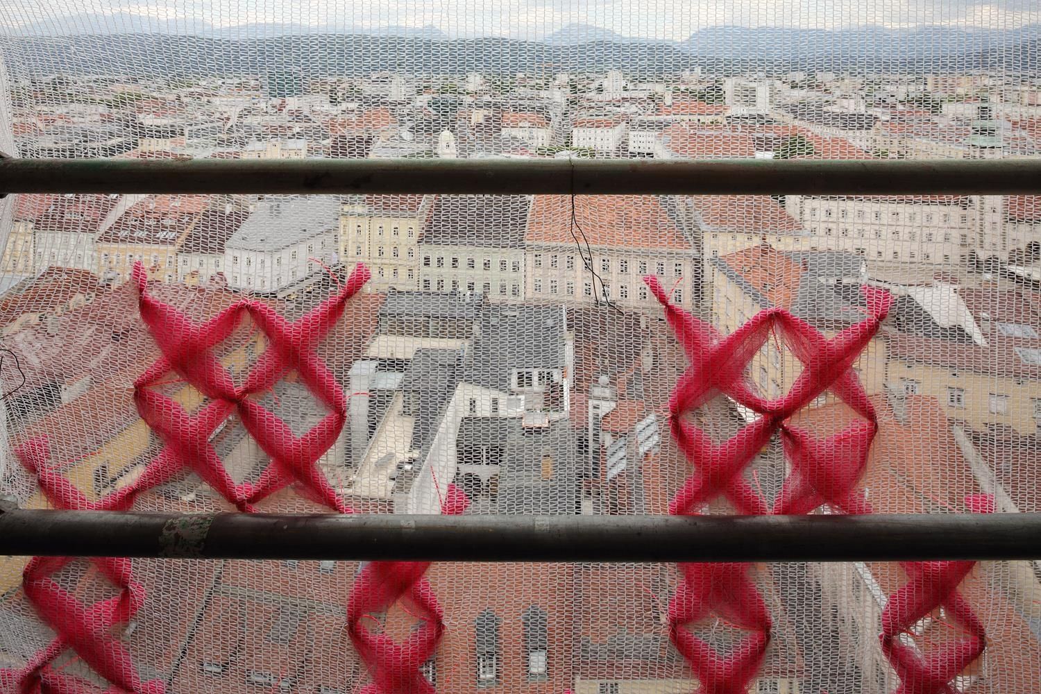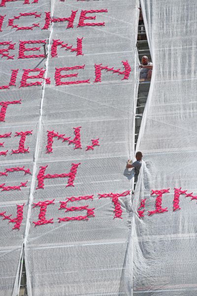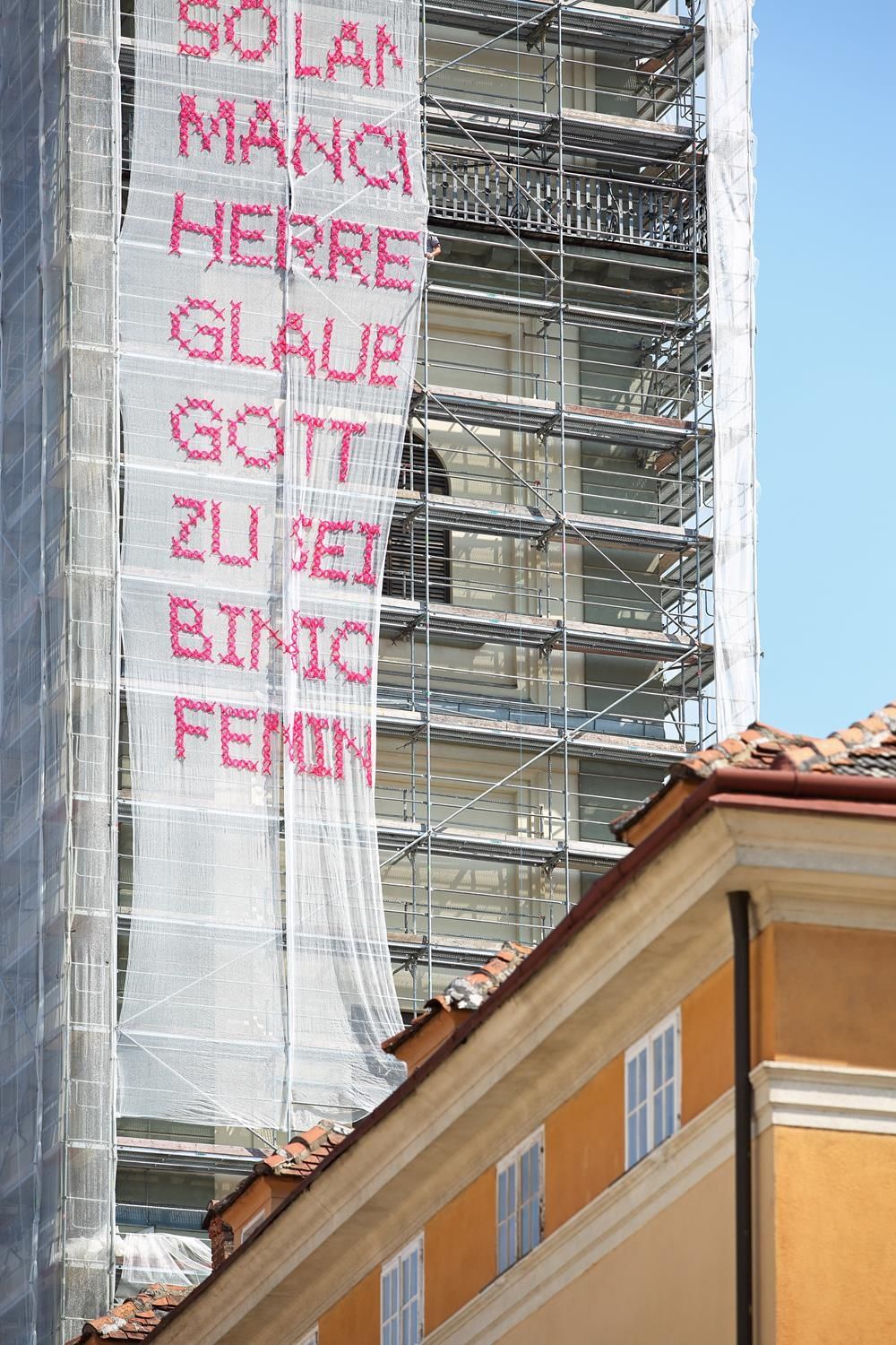 Bereits mehr als 17 mit Kabelbinder und Tüll per Hand bestickte Staubschutznetzte wurden national und international (u.A. auf der Biennale in Rabat, Marokko) auf Baustellen montiert und nun ist eine Solange-Kunstintervention von Katharina Cibulka auch in Kärnten zu sehen. Die großformatigen, im traditionellen Kreuzstich gestickten Sätze, verdeutlichen die anhaltende Notwendigkeit feministischer Forderungen. Die Themenbereiche der Solange-Sätze werden aus zahlreichen Gesprächen rund um das Thema Feminismus mit den beteiligten und betroffenen Akteur*innen vor Ort entwickelt. Könnte diese Intervention im öffentlichen Raum manche Herren dazu inspirieren ihr Verhalten zu ändern? Wielange sind SIE schon / noch Feminist:in?