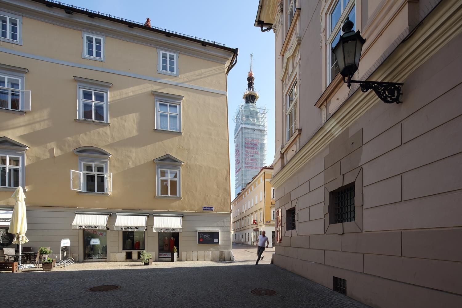 2021 lädt INS FREIE Katharina Cibulka und das „Solange…“ Projekt zu einer Intervention nach Klagenfurt ein. An einer Baustelle über den Dächern von Klagenfurt wird ein Solange… Satz angebracht und bietet Anlass für Diskussionen rund um Gleichberechtigung.