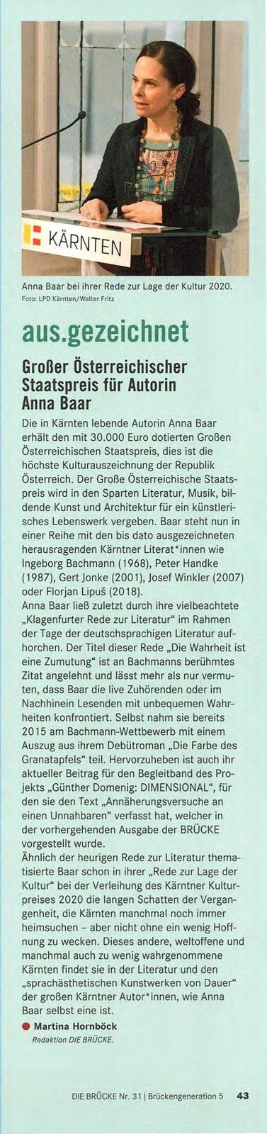 Die Brücke: "Großer Österreichischer Staatspreis für Autorin Anna Baar"