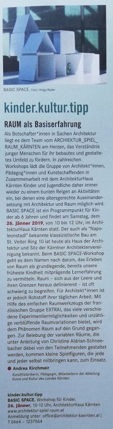 Als Botschafter*innen in Sachen Architektur liegt es dem Team vom ARCHITEKTUR_SPIEL_RAUM_KÄRNTEN am Herzen, das Verständnis junger Menschen für ihr bebautes und gestaltetes Umfeld zu fördern. In zahlreichen Workshops lädt die Gruppe von Architekt*innen, Pädagog*innen und Kunstschaffenden in Zusammenarbeit mit dem Architektur Haus Kärnten Kinder und Jugendliche daher immer wieder zu einem bunten Reigen an Aktivitäten ein, bei denen eine altersgerechte Auseinandersetzung mit Architektur und Raum möglich wird. BASIC SPACE ist ein Programm für Kinder ab 6 Jahren und findet am Samstag, dem 26. Jänner 2019 , von 10 bis 12 Uhr, im Architektur Haus Kärnten statt.