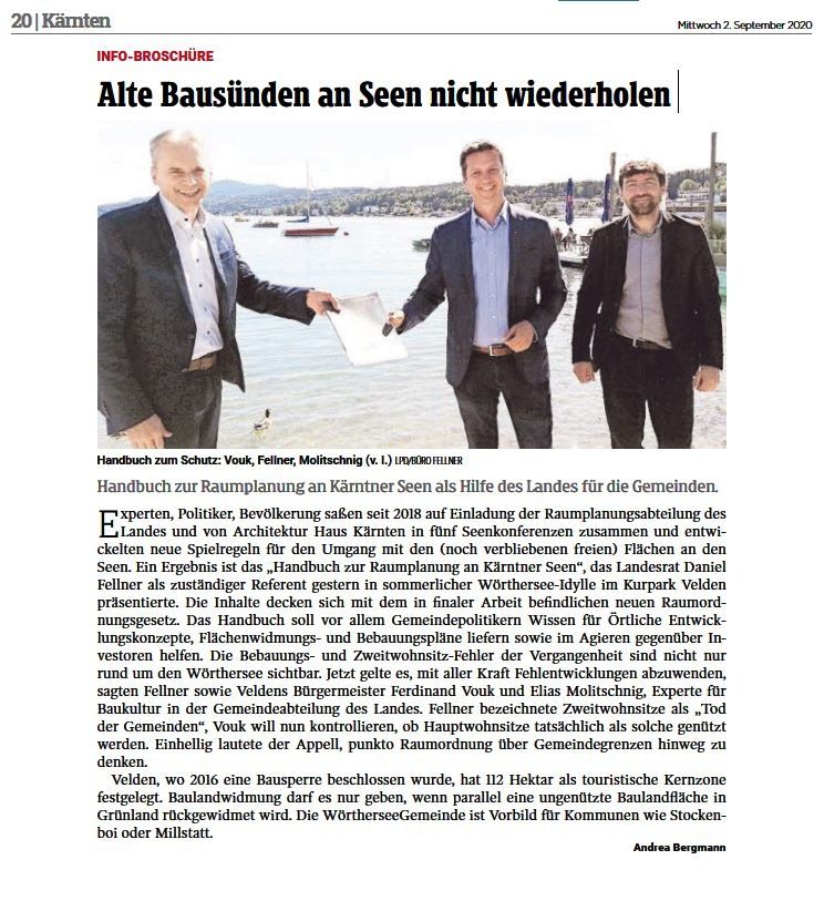 Experten, Politiker, Bevölkerung saßen seit 2018 auf Einladung der Raumplanungsabteilung des Landes und von Architektur Haus Kärnten in fünf Seenkonferenzen zusammen und entwickelten neue Spielregeln für den Umgang mit den (noch verbliebenen freien) Flächen an den Seen. Ein Ergebnis ist das „Handbuch zur Raumplanung an Kärntner Seen“, das Landesrat Daniel Fellner als zuständiger Referent gestern in sommerlicher Wörthersee-Idylle im Kurpark Velden präsentierte. Die Inhalte decken sich mit dem in finaler Arbeit befindlichen neuen Raumordnungsgesetz. Das Handbuch soll vor allem Gemeindepolitikern Wissen für Örtliche Entwicklungskonzepte, Flächenwidmungs- und Bebauungspläne liefern sowie im Agieren gegenüber Investoren helfen. Die Bebauungs- und Zweitwohnsitz-Fehler der Vergangenheit sind nicht nur rund um den Wörthersee sichtbar. Jetzt gelte es, mit aller Kraft Fehlentwicklungen abzuwenden, sagten Fellner sowie Veldens Bürgermeister Ferdinand Vouk und Elias Molitschnig, Experte für Baukultur in der Gemeindeabteilung des Landes. Fellner bezeichnete Zweitwohnsitze als „Tod der Gemeinden“, Vouk will nun kontrollieren, ob Hauptwohnsitze tatsächlich als solche genützt werden. Einhellig lautete der Appell, punkto Raumordnung über Gemeindegrenzen hinweg zu denken.