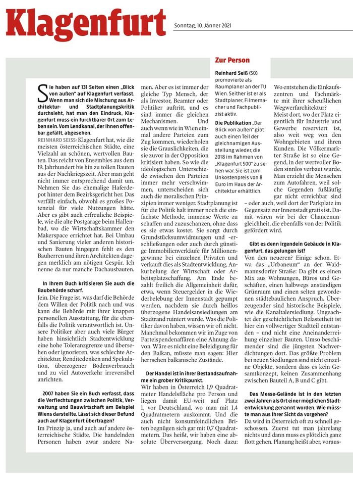 weiterlesen …Sie haben auf 131 Seiten einen „Blick von außen“ auf Klagenfurt verfasst. Wenn man sich die Mischung aus Architektur- und Stadtplanungskritik durchsieht, hat man den Eindruck, Klagenfurt muss ein furchtbarer Ort zum Leben sein. Vom Lendkanal, der Ihnen offenbar gefällt, abgesehen.