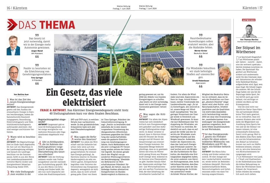 ANTWORT: Vor allem der Alpenverein hat sich wiederholt kritisch zum Energiewendegesetz geäußert und eine mehrseitige Stellungnahme eingereicht. In dieser verweist er darauf, dass in Kärnten bilanziell 100 Prozent der Stromenergie und 60 Prozent der Gesamtenergie aus erneuerbarer Energie kommen. Die bilanzielle Menge bedeutet allerdings, dass es zu gewissen Zeiten wie etwa im Winter nicht genug Strom aus Wasserkraft erzeugt wird, während es im Sommer eine Überproduktion gibt. Darüber hinaus führt der Alpenverein wichtige Freizeit- und Wirtschaftsinteressen wie sanften Tourismus ins Feld, die eine Erhaltung der unverbauten Landschaft erfordern. Vor allem die Windräder sind dem Alpenverein ein Dorn im Auge. Arnold Riebenbauer, zweiter Vorsitzender des Landesverbandes, sagt: „Es ist zu hinterfragen, wie sinnvoll es ist, unsere Berge mit Windkraft zuzupflastern.“ Nur ein geringer Prozentsatz der Energie werde in Österreich aus Windkraft gewonnen. Es brauche laut Riebenbauer eine Verdoppelung der Windräder, um vier Prozent zu erreichen. Bedenklich sei auch, dass es aufgrund der Größe und des Gewichts der Windräder stark befestigte Straßen auf den Bergen brauche. Außerdem fordert der Alpenverein ein, dass das Land auch Energiespar-Potenziale auslotet. Darauf pochen auch die Mitglieder des Fachbeirates für Baukultur, die ebenfalls eine Stellungnahme abgegeben haben, die unter anderem vom Kärntner Kulturgremium, dem Architekturhaus Kärnten, dem Bauarchiv Kärnten sowie der Zentralvereinigung der Architekten unterstützt werde. Architekt Werner Kircher, der Mitglied des Baukultur-Beirates ist, kritisiert, dass im Gesetz der Produktion von Energie „absolute Priorität“ eingeräumt wird, aber Kultur- und Naturlandschaften, Ortsbildqualitäten und die Qualitäten von wertvollen Ensembles nicht berücksichtigt werden. 2030 sei zwar eine Evaluierung der „raumbedeutsamen Auswirkungen“ des Energiewendegesetzes vorgesehen, doch dafür fehlen Qualitätsmaßstäbe und Werteskalen.