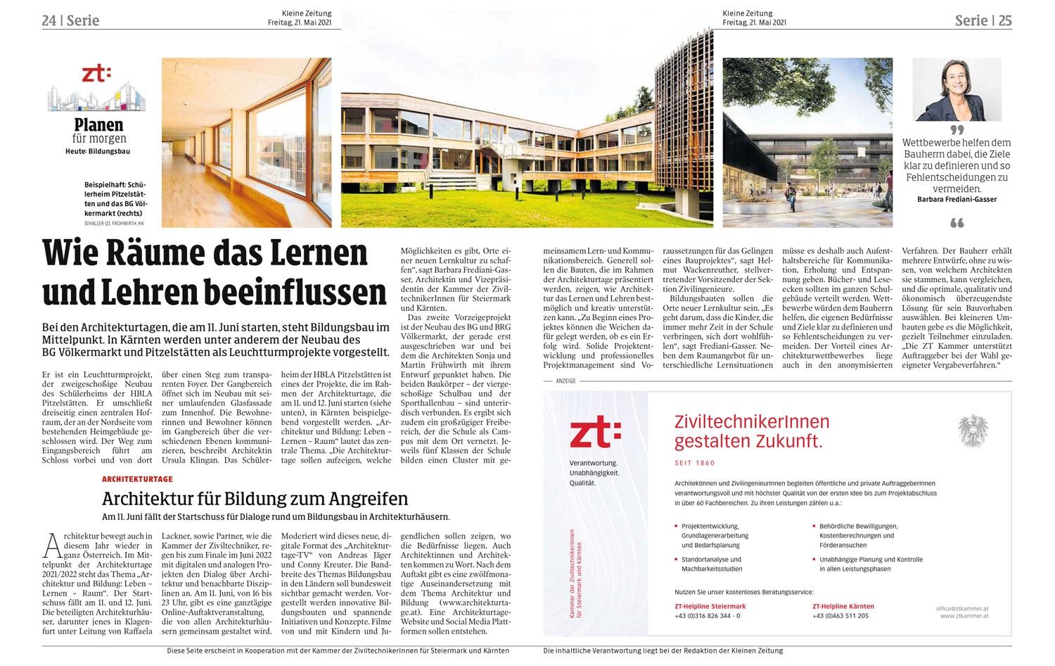 Er ist ein Leuchtturmprojekt, der zweigeschoßige Neubau des Schülerheims der HBLA Pitzelstätten. Er umschließt dreiseitig einen zentralen Hofraum, der an der Nordseite vom bestehenden Heimgebäude geschlossen wird. Der Weg zum Eingangsbereich führt am Schloss vorbei und von dort über einen Steg zum transparenten Foyer. Der Gangbereich öffnet sich im Neubau mit seiner umlaufenden Glasfassade zum Innenhof. Die Bewohnerinnen und Bewohner können im Gangbereich über die verschiedenen Ebenen kommunizieren, beschreibt Architektin Ursula Klingan. Das Schülerheim der HBLA Pitzelstätten ist eines der Projekte, die im Rahmen der Architekturtage, die am 11. und 12. Juni starten (siehe unten), in Kärnten beispielgebend vorgestellt werden. „Architektur und Bildung: Leben – Lernen – Raum“ lautet das zentrale Thema. „Die Architekturtage sollen aufzeigen, welche Möglichkeiten es gibt, Orte einer neuen Lernkultur zu schaffen“, sagt Barbara Frediani-Gasser, Architektin und Vizepräsidentin der Kammer der ZiviltechnikerInnen für Steiermark und Kärnten.