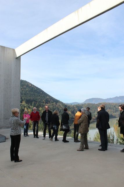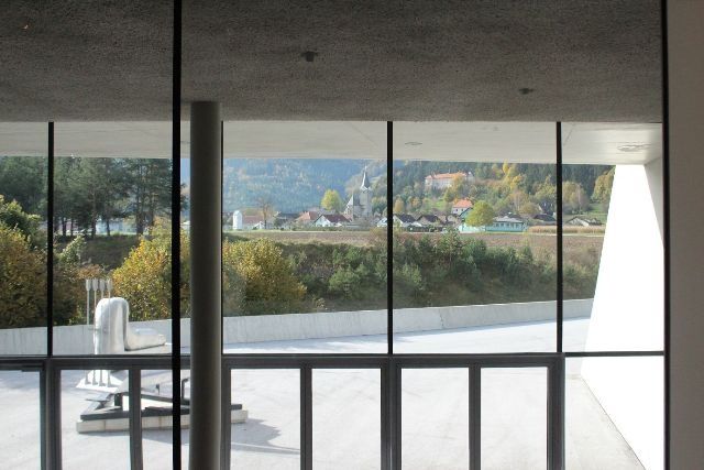 Wie eine Skulptur in der Landschaft ragt der langezogene Museumsbau auf einem stark abfallenden Hochplateau 70m über der Drau. Die Eingangszone orientiert sich zum Ortszentrum von Neuhaus und zum darüberliegenden historischen Schloss des Auftraggebers. Der Kern der Anlage ist die 160m lange tageslichtdurchflutete Ausstellungshalle mit angeschlossenen, großzügigen Terrassen und mobilen Trennwänden.