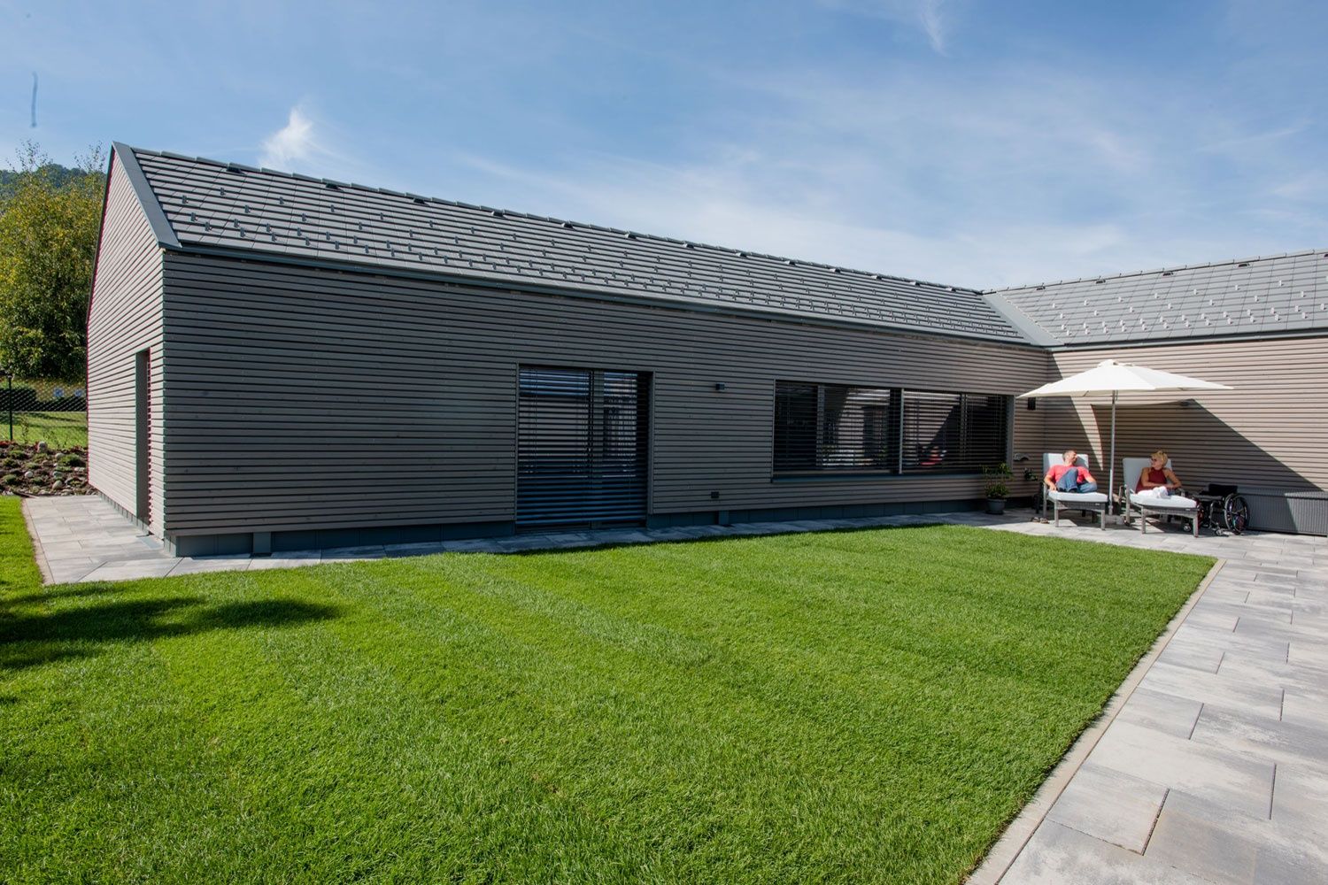 Dieses barrierefreie Zuhause für eine 5-köpfige Familie befindet sich am Fuße des Ulrichsberg und wurde in Holzriegelbauweise errichtet. Der abgewinkelte Baukörper bildet gemeinsam mit Carport und Technikraum eine Hofsituation mit viel Privatsphäre. Das Satteldach mit offener Dachuntersicht erzeugt im Inneren des Gebäudes ein großzügiges Raumvolumen. Die Innenwände sind mit gekalkter Fichte verkleidet. Dies schafft eine angenehmes Raumklima. Viel Stauraum bieten die vom Tischler gefertigten Einbaumöbel, die individuell an die Bedürfnisse der Bewohner angepasst sind.