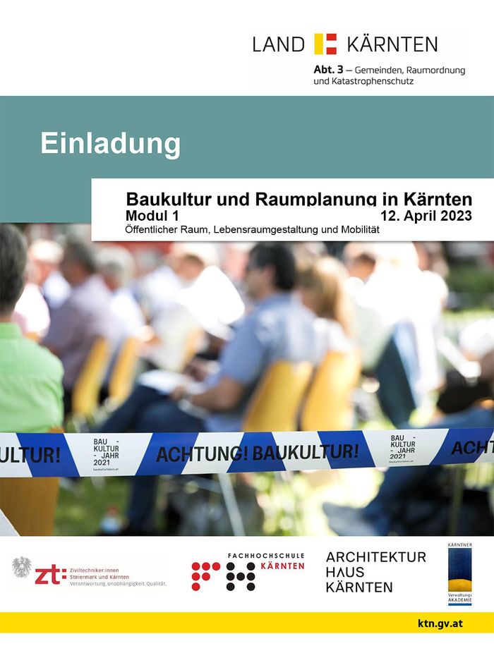 Die Siedlungstätigkeiten in Kärnten werden durch eine qualitätsvolle Baukultur und einer vorausschauenden Raumordnung geprägt Deshalb ist es wichtig den Gemeinden ein Handwerkszeug zu reichen, welches bei der Siedlungs- und Ortsentwicklung unterstützend wirkt Dazu bietet das Land Kärnten in Kooperation mit dem Architektur Haus Kärnten, der Fachhochschule Kärnten, der Kärntner Verwaltungsakademie und der Kammer der Ziviltechniker innen für Steiermark und Kärnten einen Crashkurs zur Vermittlung baukultureller und raumplanerischer Werte an.