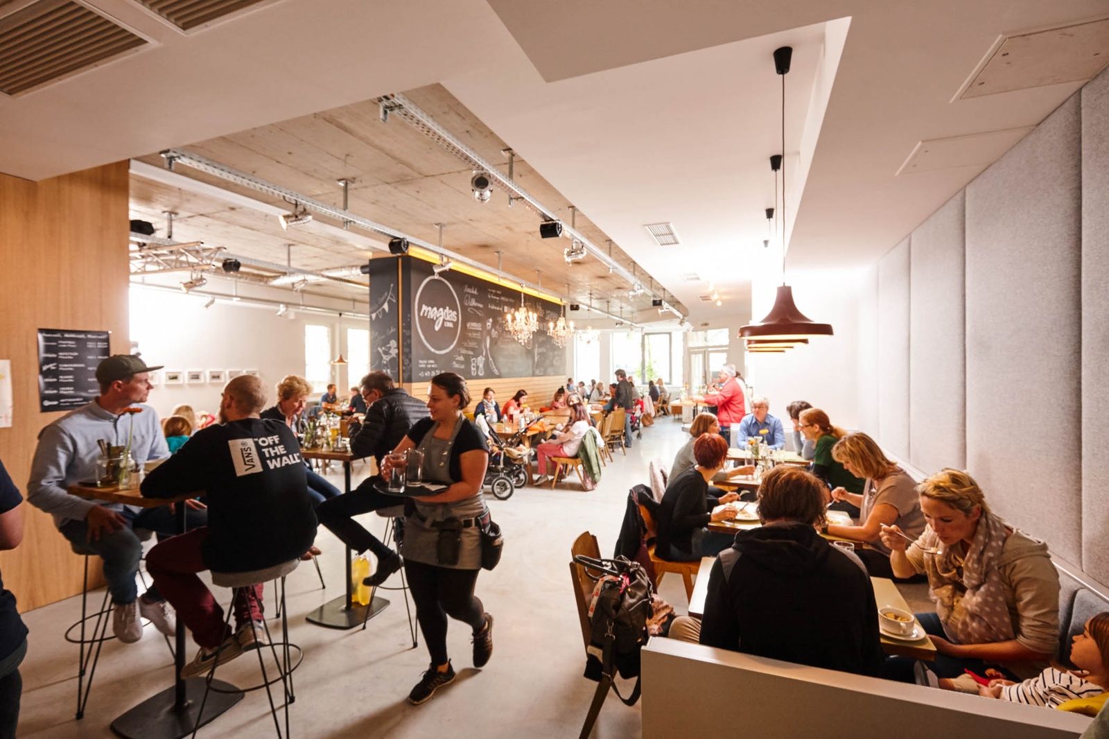 Den hallenartigen Charakter des Lokals versuchte der letzte Pächter, ein Grieche, durch griechische Säulen, Verzierungspaneelen und jeder Menge verbauter Sitzecken Herr zu werden. Da von Anfang an feststand, dass möglichst viel vom Bestand in upgecycelter Form verwendet werden sollte, galt es in einer Bestandsaufnahme das Verwertbare herauszuschälen und die Räume von überflüssigem Ziergut zu befreien. Puristisch und unter Verwendung einiger weniger Materialien und Farben wurde das Lokal in verschiedene Bereiche zoniert. Der weitläufige Raum wurde durch eine zentrale Holzwand geteilt, die als Rückenteil für eine lange Sitzbank einerseits und als Bücherregal andererseits dient. Zwei große Eichentische sind vor dem Raumteiler positioniert und sollen großen Gruppen Platz bieten, es aber auch ermöglichen, dass hier einzelne Gäste ins Gespräch kommen. Auf der großen Tafelfläche darüber, ist das tägliche Mittagsmenü und auch sonst so einiges angeschrieben. Die Rückseite wird zu einem überdimensionalen Wohnzimmerregal voller Bücher. Hier lässt es sich schmökern und stöbern. Für Veranstaltungen kann aus der Holzwand eine raumhohe Schiebetür geschoben werden und der Gastraum kurzerhand in einen Zuschauerraum verwandelt werden. Das Bühnenpodest kann bei normalem Betrieb zum Sitzen verwendet werden und wird über Eck zu einem Loungebereich mit gemütlichen Sofas. Bestandseckbänke wurden neu tapeziert und gestrichen und bilden nun gemütliche Sitznischen. Weitere Sitzbereiche sind als Inseln in den Raum gestellt. Der Barbereich wird durch Zementfliesen und ungenutzte Stiegenhausbeleuchtungskörper charakterisiert.