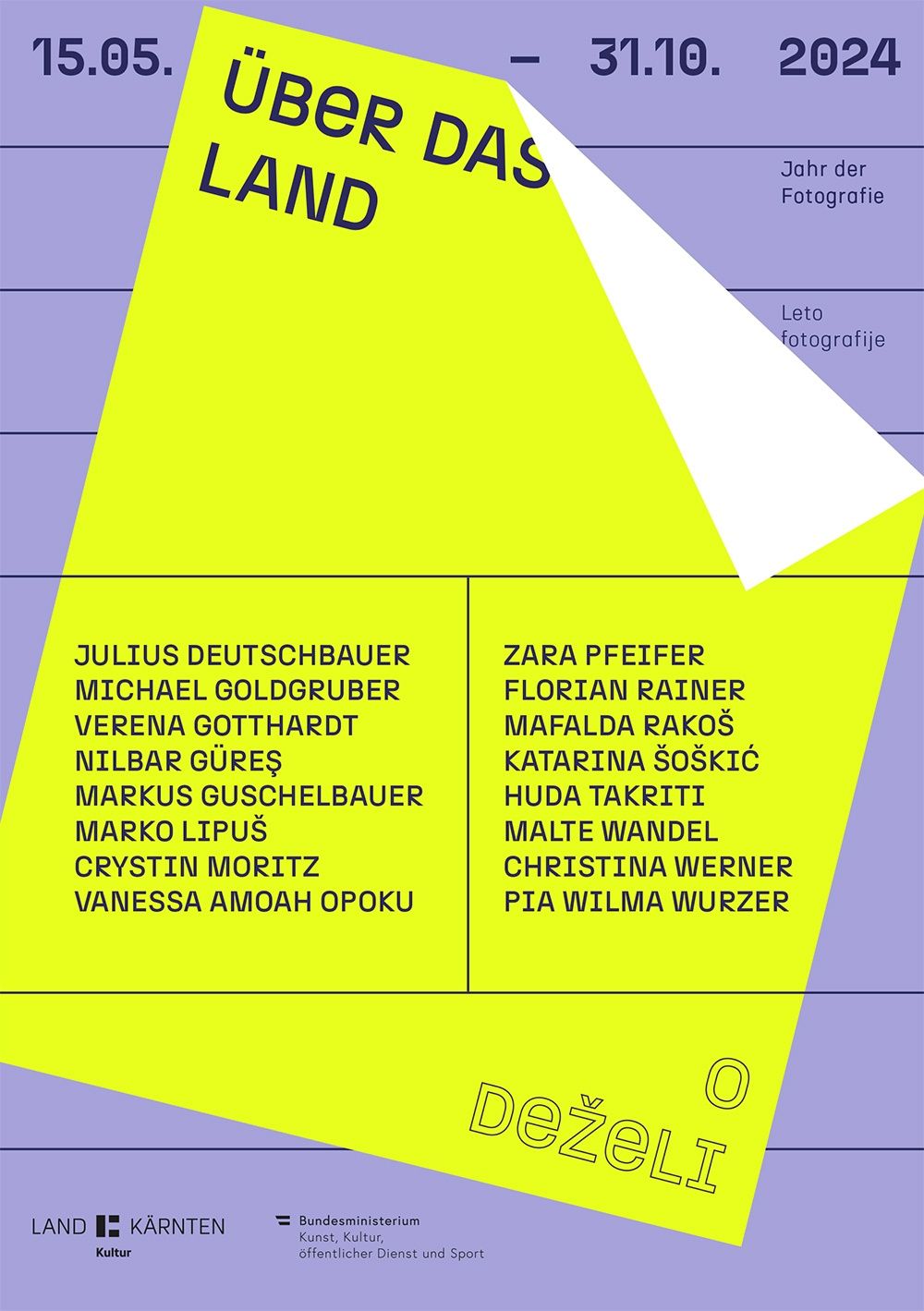 ÜBER DAS LAND / O DEŽELI präsentiert eine Plakatserie von 16 Künstler:innen, die in ganz Kärnten zu sehen ist. Die begleitende Ausstellung findet im Raum für Fotografie und im Kärnten Museum statt. Darüber hinaus dient ÜBER DAS LAND / O DEŽELI als Plattform für eine Vielzahl von Ausstellungen, Projekten und Workshops von Partnerinstitutionen.