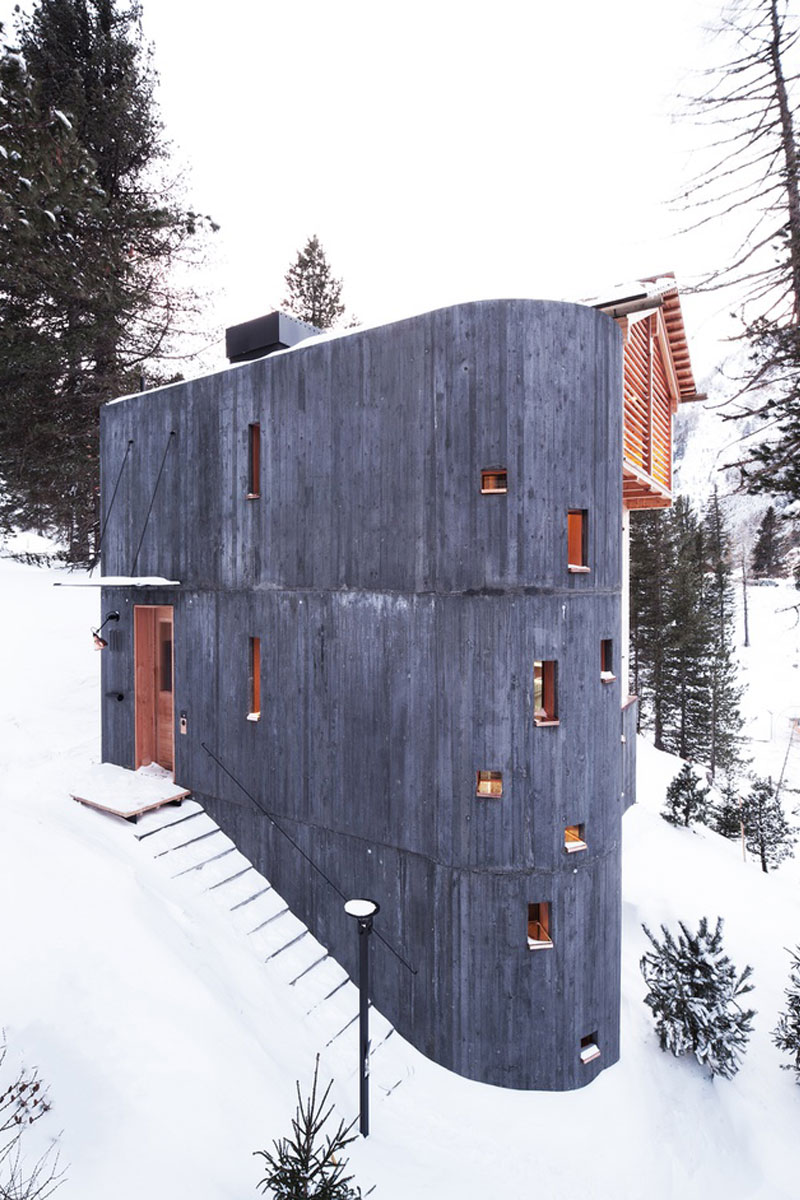 Drei Bauten in Holzblockbauweise mit in die Konstruktion eingefräster Dämmung bilden ein kleines Feriendorf auf der Turrach. Sie wurden nahe der Straße zwischen die Bäume gesetzt, um so den Lärchen- und Zirbenbestand möglichst unberührt zu lassen. Zum Ensemble gehört auch eine „Scheune“ mit einem großen Gemeinschaftsraum, der für verschiedene Ereignisse und Feste gemietet werden kann. Diese „Scheune“ wurde in Holzständerbauweise mit vertikaler Holzlattenfassade errichtet. Alle Nebengebäude und Sockelbereiche sind eine Betonsandwichkonstruktion.