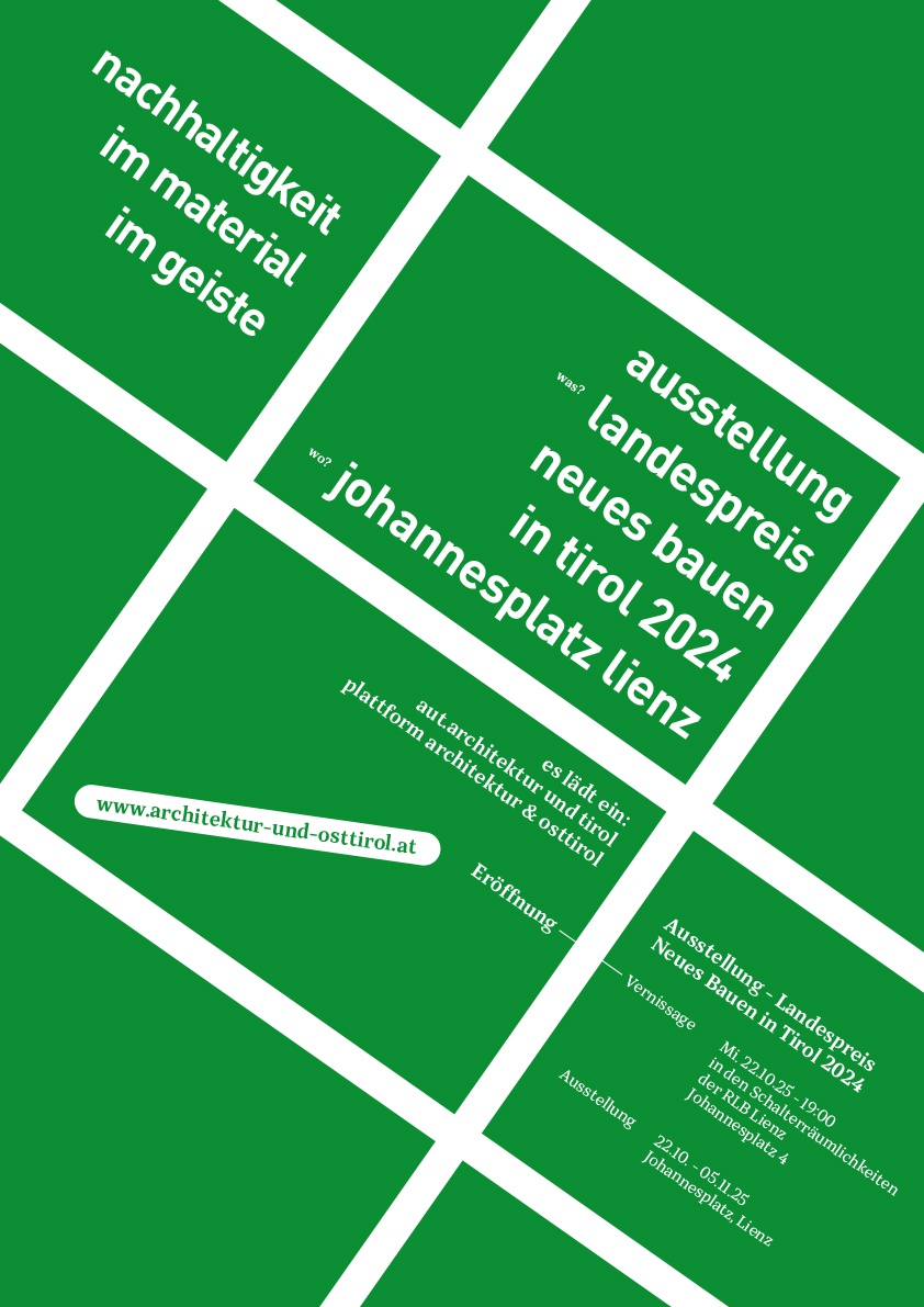 Diese Ausstellung geht – mit Unterstützung des Landes Tirol, der Kammer der Ziviltechniker:innen | Arch+Ing Tirol und Vorarlberg, Sektion Architekt:innen und des aut – in einer eigens für den öffentlichen Raum konzipierten Version auf Wanderschaft quer durch Tirol. Auf insgesamt 10 Planen sind sämtliche Preisträger-Projekte mit großformatigen Bildern und Auszügen aus der Jurybegründung präsentiert sowie sämtliche Einreichungen fotografisch dokumentiert. Damit bietet die Ausstellung nicht nur in der Landeshauptstadt der interessierten Öffentlichkeit eine gute Gelegenheit, sich einen Überblick über das aktuelle Architekturgeschehen in Tirol zu verschaffen.