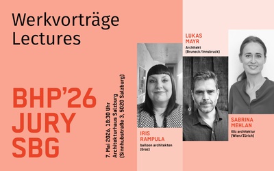 In kurzen Werkvorträgen stellen sich die Juror*innen der Nominierungsjury (Salzburg) des Bauherr:innenpreises 2026 vor. Dazu gehören Iris Rampula-Farrag (balloon architekten, Graz), Sabrina Mehlan (illiz architektur, Wien/Zürich) und Lukas Mayr (Bruneck/Innsbruck).
