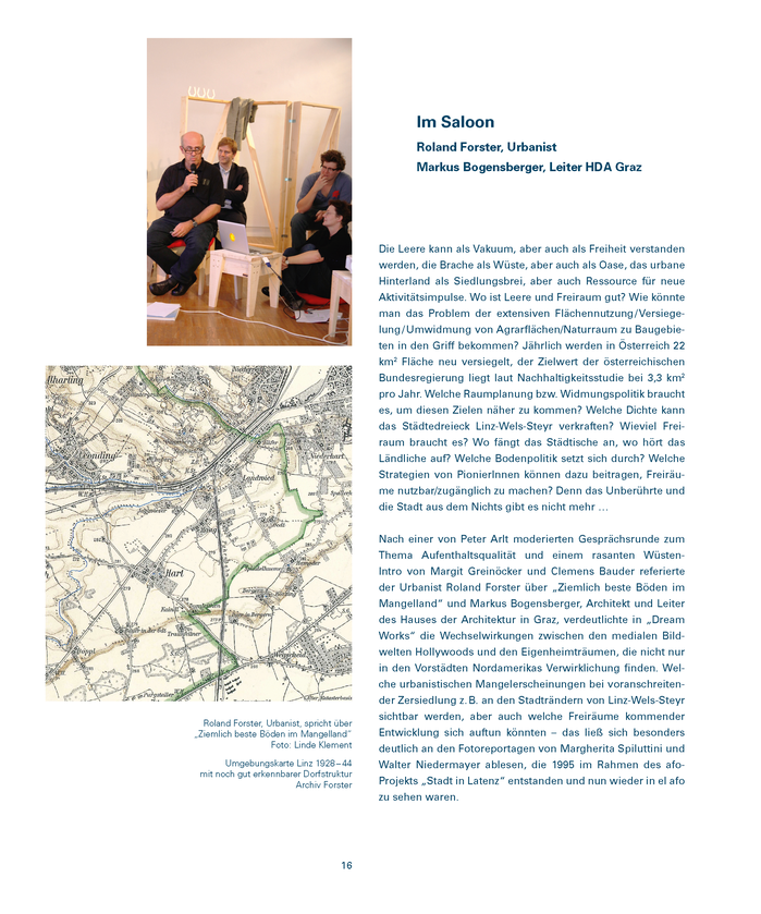 Das 20-jährige Bestehen des afo architekturforum oberösterreich gab Anstoß, ein Projekt aus den Anfängen des 1994 gegründeten Vereins neuerlich ins Blickfeld zu rücken. Der in Stadt in Latenz 1 erprobte Ansatz, sich dem Thema Stadt /Land von den Rändern und Zwischenräumen her zu nähern, erschien uns aus heutiger Sicht gleichermaßen reizvoll wie die Abkehr von der normativen Kraft eines allumfassenden „Masterplans“. Der Zweifel an ihrer Wirkmacht ist in Zeiten, in denen sich viele nach einer neuen Ordnung sehnen, notwendiger denn je. Die als chaotisch empfundenen Bebauungsformen in Städten und ländlichen Regionen könnten zwar zu Alternativansätzen Anstoß geben, verführen aber in der Regel dazu, in der Klage zu verharren oder auf eine fehlende übergeordnete Instanz zu verweisen.