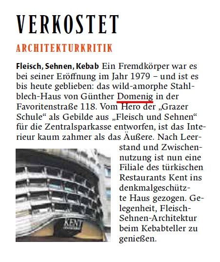Fleisch, Sehnen, Kebab Ein Fremdkörper war es bei seiner Eröffnung im Jahr 1979 – und ist es bis heute geblieben: das wild-amorphe Stahlblech-Haus von Günther Domenig in der Favoritenstraße 118. Vom Hero der „Grazer Schule“ als Gebilde aus „Fleisch und Sehnen“ für die Zentralsparkasse entworfen, ist das Interieur kaum zahmer als das Äußere. Nach Leerstand und Zwischennutzung ist nun eine Filiale des türkischen Restaurants Kent ins denkmalgeschützte Haus gezogen. Gelegenheit, Fleisch-Sehnen-Architektur beim Kebabteller zu genießen.