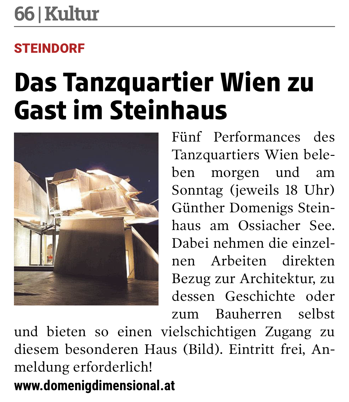 Fünf Performances des Tanzquartiers Wien beleben morgen und am Sonntag (jeweils 18 Uhr) Günther Domenigs Steinhaus am Ossiacher See. Dabei nehmen die einzelnen Arbeiten direkten Bezug zur Architektur, zu dessen Geschichte oder zum Bauherren selbst und bieten so einen vielschichtigen Zugang zu diesem besonderen Haus (Bild). Eintritt frei, Anmeldung erforderlich!