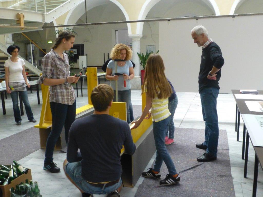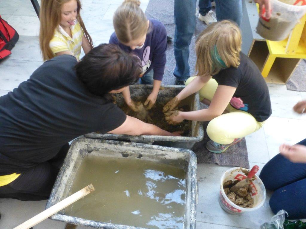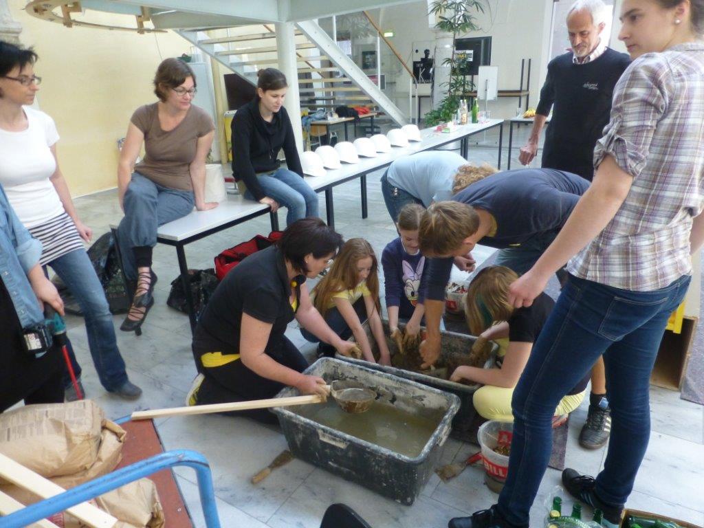 In einem spannenden Workshop am 9. Mai 2015 konnten Jung und Alt mit dem Naturmaterial LEHM experimentieren, seine Eigenschaften als Rohmaterial und gemischt mit Wasser, als formbarer Baustoff vergleichen, die verschiedenen Zustände des Lehms mit Händen, Augen und Nase durch Fühlen, Sehen und Riechen erleben und sich an einem Raumexperiment aus Lehm und GLASFLASCHEN versuchen.