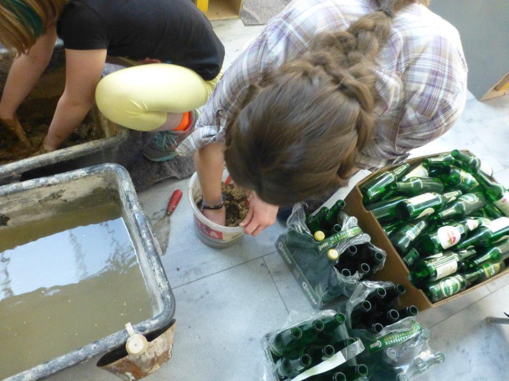 Zuerst wird der Lehm mit Wasser gemischt – das Bedürfnis der WorkshopteilnehmerInnen den Lehm mit den Händen zu mischen war groß – anschließend eine Schalung für die Wandelemente des Raumexperiments gebaut und die Glasflaschen nach ihrer Größe sortiert. Die Flaschen und das feuchte Lehm-Wasser-Gemisch wurden abwechselnd in die Schalung eingebracht und so vertikale Elemente geformt, die durch den Einbau der grünen, braunen und weißen Glasflaschen ein schönes Lichtspiel verschiedener Materialien und unterschiedlicher Durchlässigkeit erzeugen.