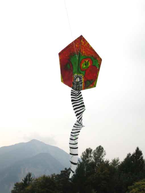 Wenn das Papier getrocknet ist, wird ein Gerüst aus Bambus auf die Rückseite geklebt. Anschließend wird Kreppapier, Waageschnüre und Flugleinen befestigt. Zum Abschluß zeigt der Flugtest, ob die Drachen-Häuser die Wolken kratzen.