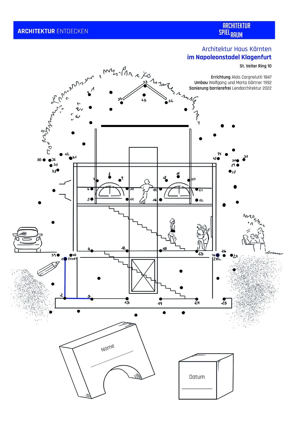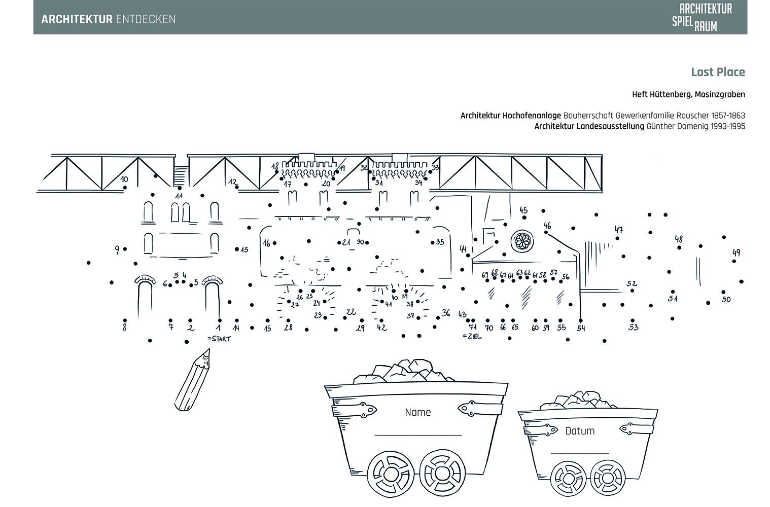 Die Arbeitsblätter können als Vermittlungsinstrument in Schulen und baukulturellen Institutionen eingesetzt werden und sollen zum Besuch der jeweiligen Bauwerke anregen. Die ansprechend gestalteten Karten laden Baukulturvermittler*innen, Jugendliche, Kinder, Pädagog*innen und Schulklassen zum Mitmachen ein: Kurze geschichtliche Informationen zur Entstehung des Bauwerks, Besonderheiten, Materialkunde und interessante Eckdaten wechseln sich mit konkreten Fragestellungen und Hinweisen auf weiterführende Literatur ab. Ein spannendes Punkt-zu-Punkt Bild ermöglicht es, das Bauwerk auch mit dem Stift zu „entdecken“ und die Scheu vor dem Selber-Zeichnen zu überwinden.