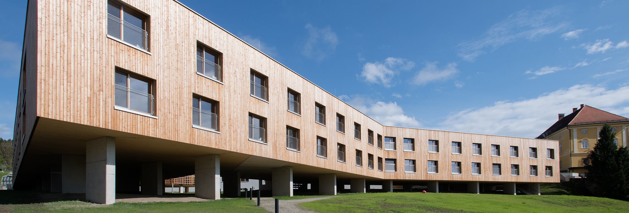 Das SchülerInnenheim der Höheren Bundeslehranstalt für Landwirtschaft und Ernährung in Pitzelstätten, Klagenfurt wurde erweitert und im Zuge dessen auch der Bestand saniert. 200 Internatsplätze stehen den Mädchen und Buben zur Verfügung, die nun in großzügigen Zweibettzimmern mit Vorraum, Bad und WC wohnen. Überall im „Pitzheim“ ist Holz sicht- und spürbar, bei den Wänden, den Böden und den Möbeln. Dafür wurden verschiedene Holzarten eingesetzt. Entlang der fast bodentiefen Lärchenholzfenster auf den Gängen ziehen sich bequeme Sitzbänke aus Holz. Eine „Chillzone“ mit hohen Holzstufen, angelegt wie ein antikes Theater, kann vielseitig verwendet werden.