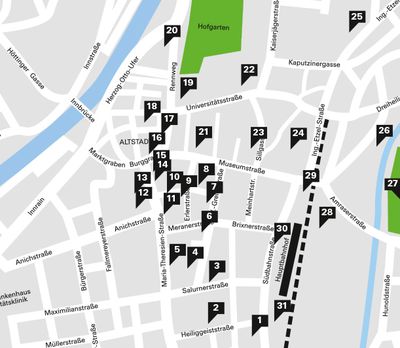Kurzübersicht über zeitgenössische Architektur in der Innsbrucker Innenstadt für interessierte StadtbesucherInnen. (Übersicht inkl. Stadtplan als pdf downloadbar)
