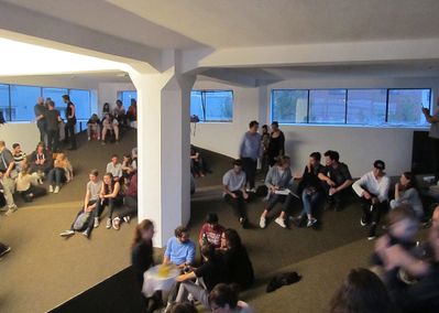 Führung mit den Studierenden durch die hinter dem Universitätshauptgebäude errichtete Kinderbetreuungseinrichtung "Spielräume".
