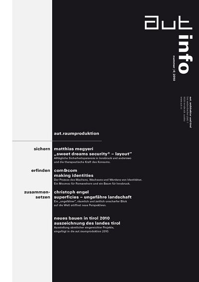 Die Ausgabe 4/10 der Programmzeitschrift aut: info mit Hintergrundinformationen zum letzten Teil der Ausstellungsreihe "aut.raumproduktion" sowie zum Programm des aut zwischen September und Dezember 2010.