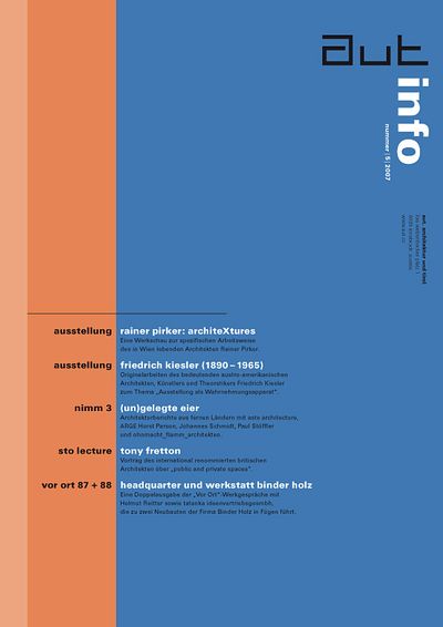 Die Ausgabe 5/07 der Programmzeitschrift aut: info mit Hintergrundinformationen zu den Ausstellungen von Rainer Pirker und Friedrich Kiesler sowie zum Programm des aut zwischen September und November 2007.