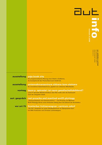 Die Ausgabe 3/06 der Programmzeitschrift aut: info mit Hintergrundinformationen zu den Ausstellungen „Paju Book City“ und „Technologie und Landschaft “ und zum Programm des aut zwischen Mai und Juni 2006.