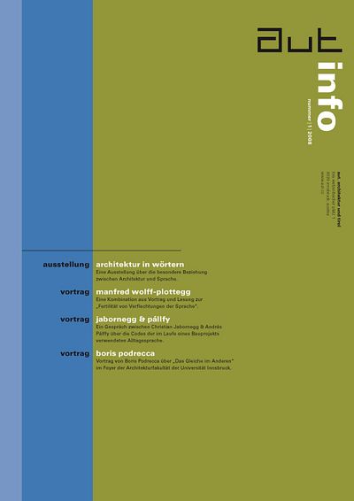Die Ausgabe 1/08 der Programmzeitschrift aut: info mit Hintergrundinformationen zur Ausstellung „Architektur in Wörtern“ sowie zum Programm des aut zwischen November 2007 und Jänner 2008.