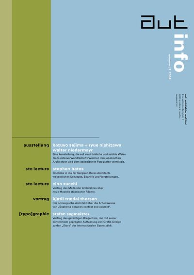 Die Ausgabe 2/08 der Programmzeitschrift aut: info mit Hintergrundinformationen zur Ausstellung „Sejima + Ryue Nishizawa (SANAA) und Walter Niedermayr“ sowie zum Programm des aut zwischen März und Juni 2008.