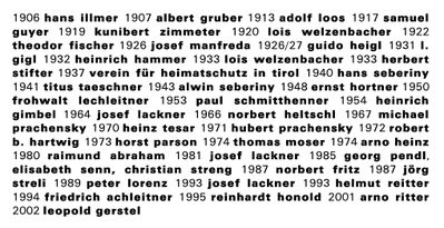 Gerhard Fritz • Wolfgang Pöschl, Rainer Köberl, Hans Efferl • Wolfgang Andexlinger • Martin Baltes • LAAC • Hans-Peter Bock • Rens Veltman • columbosnext, Tortenwerkstatt • Ernst Beneder • Klaus Lugger • Jörg Streli • Johannes Kostenzer • Monika Abendstein • Karl Heinz, Gretl Köfler, Veit Streli • Volker Giencke • Klaus Juen, Roland Gruber, Rainer Köberl, Martin Scharfetter • Bazon Brock • Christoph Katzler • Martin & Werner Feiersinger • Antje Ehmann • David Schreyer, Herta Hurnaus, Paul Ott • Lars Müller • Patrick Lüth • Peter Volgger • Arno Brandlhuber