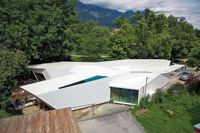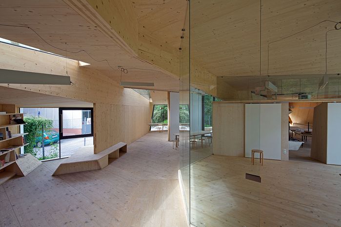 Entstanden ist ein pavillonartiges Werkstättengebäude, das nicht nur den Kindern und Jugendlichen als NutzerInnen ein optimales Raumangebot bietet, sondern auch den Park durch seine einzigartige Architektur bereichert. Vorgelagerte Terrassen und raumhohe Glasfronten verbinden den geschwungenen Baukörper mit der Umgebung, im Inneren bilden schräge Böden und Wände ein fließendes Kontinuum an Räumen mit unterschiedlichen Atmosphären und Arbeitsmöglichkeiten.