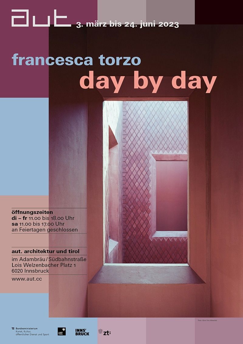 Die von Francesca Torzo für das aut konzipierte Ausstellung „Day by Day“ ist ihre erste große Personale. In Form eines atmosphärisch dichten Parcours durch unsere Räumlichkeiten werden einige der für sie wesentlichen architektonischen und gesellschaftlichen Fragestellungen verhandelt und die Arbeitsweise des Büros vorgestellt. So veranschaulichen auf Tücher projizierte, animierte Zeichnungen den Gedankenfluss im Entstehungsprozess und großformatige Seidendrucke geben Einblick in Torzos auf jahrelangen Reisen entstandenes Bildarchiv an Referenzen. Gezeigt werden auch Kontext- und Gebäudemodelle und einige der u. a. für die Brüsseler Galerie Maniera entworfene Möbel. Ein „Archiv des Ateliers“ präsentiert Experimente, aber auch Misserfolge und macht die Menschen sichtbar, mit denen das Atelier zusammengearbeitet hat. Denn ein Gebäude ist für Francesca Torzo immer das Ergebnis der Arbeit vieler Menschen, die es zu würdigen gilt.