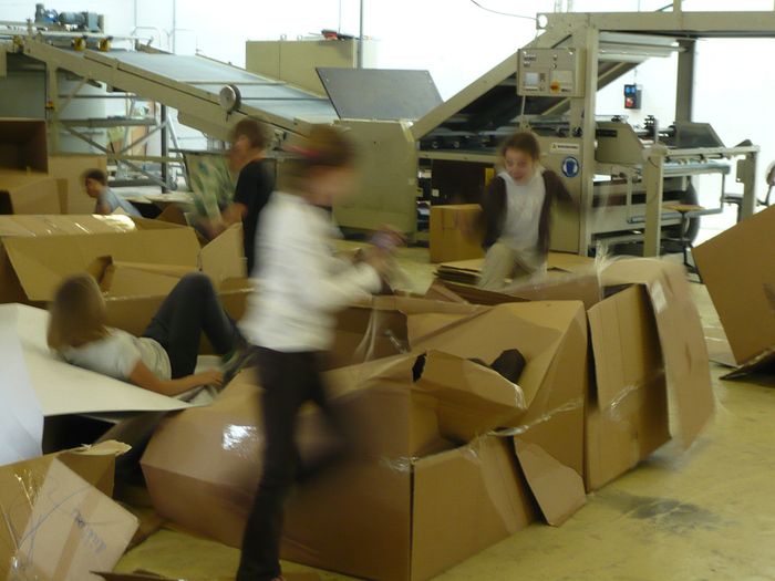 Wie aus einem Bogen Karton, gerade einmal 2 mm dick, eine Schachtel wird, das werden wir in der Kartonagenfabrik Dinkhauser sehen können. Eckig, schmal, rund und lang von außen – und von innen? Was spielt sich wohl in den Schachteln ab? Das können so verrückte Geschichten sein, wie sie sonst in Büchern erzählt werden: da gibt es vielleicht ein Zimmer mit tausend Spiegeln an der Decke, mit einem Loch, durch das man zum lärmempfindlichen Nachbarn kommt, der in einer Schaumstoff gepolsterten Röhre wohnt, gleich neben den fünf Kletterfreunden, die auf dreieckigen Schachtelhäusern herum turnen und einen Gipfel nach dem anderen erklimmen.