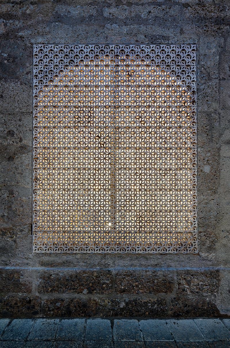 An der Fassade wurden die vorgefundenen Fensteröffnungen mittels fassadenbündig eingesetzter, zart perforierter Keramik-Arabesken geschlossen und damit der Charakter einer Stadtmauer wiederhergestellt. Die dabei eingesetzte Fliesenserie wurde eigens für dieses Projekt entwickelt und von Hand gefertigt.