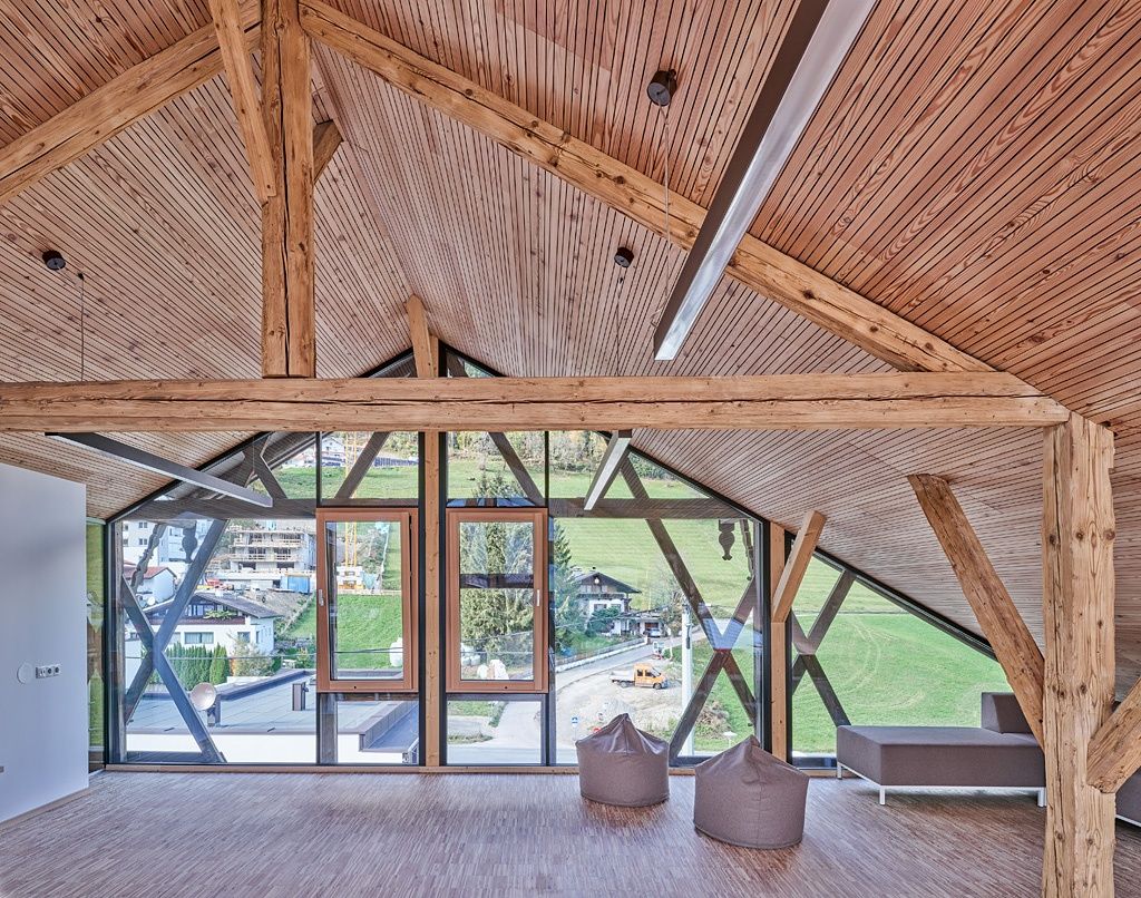 Das Haupthaus wurde saniert, geöffnet und räumlich „entrümpelt“, ein kleinerer Zubau durch einen monolithischen Holzkubus ersetzt, der die traditionellen Bauformen zeitgenössisch interpretiert. Die beiden Geschoße im Um- und Zubau sind durch eigene Zugänge klar in organisatorische Einheiten getrennt. Im Erdgeschoß gibt es je einen Gruppenraum für Kindergarten und Krippe sowie einen Bereich für den Mittagstisch, im Obergeschoß liegen zwei Klassenzimmer mit einer gemeinsamen offenen Lernlandschaft. Der bisher ungenutzte Dachboden wurde ohne große bauliche Eingriffe in einen hohen, luftigen Raum ohne festgelegten Zweck verwandelt.
