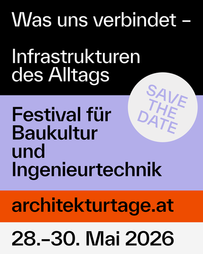 Die Architekturtage – das biennale Festival für Baukultur und Ingenieurtechnik – sind die größte Publikumsveranstaltung für Architektur und Baukultur in Österreich. Kuratiert und umgesetzt von den Architekturhäusern Österreichs und dem Architekturzentrum Wien, findet die kommende Ausgabe von 28. Mai – 30. Mai 2026 unter dem Motto Was uns verbindet – Infrastrukturen des Alltags statt.