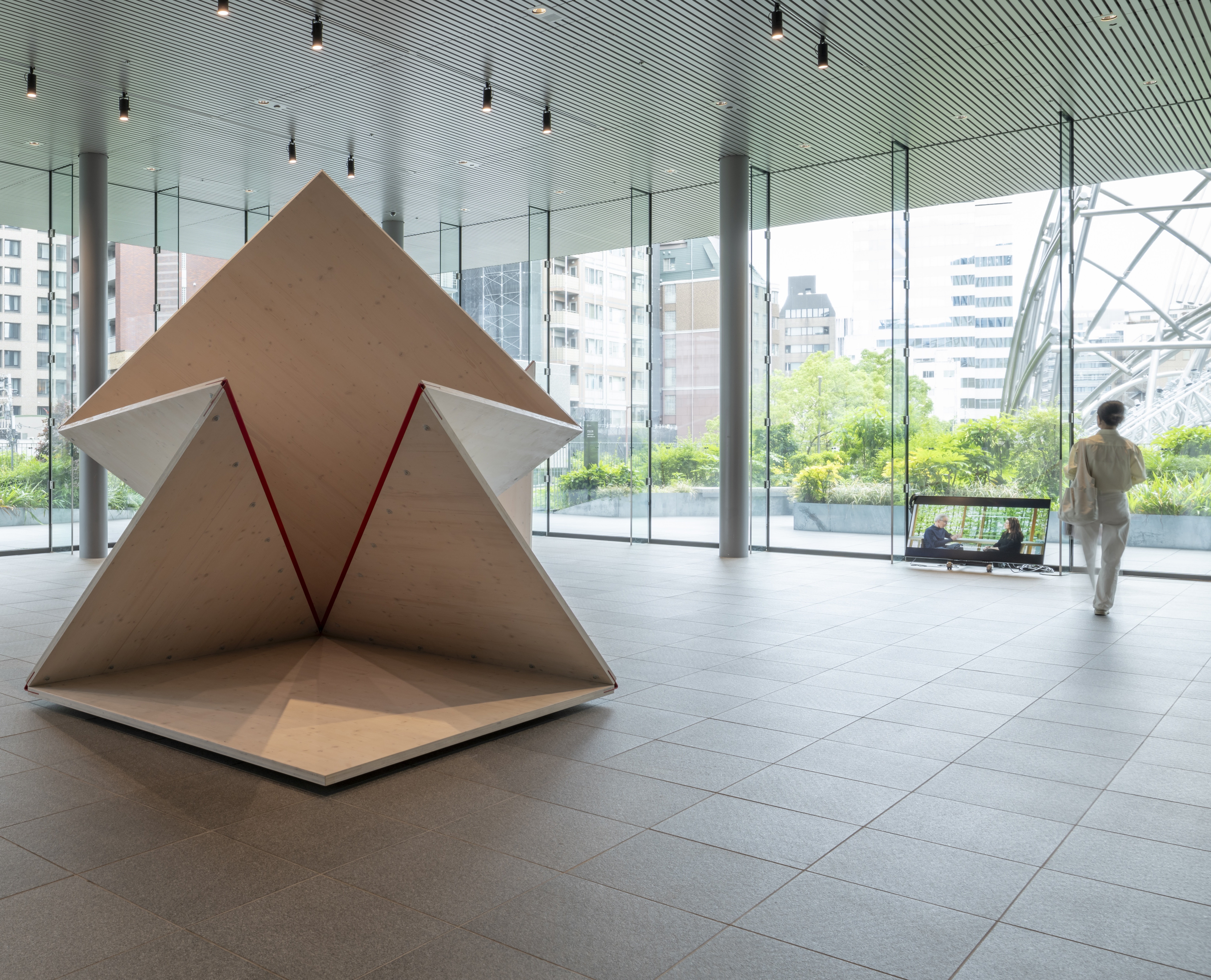 Die drei Holzskulpturen von „verywood“ öffnen sich wie übergroße Origami in Anspielung auf die Tektonik heutiger Holzarchitektur mit flächigen Werkstoffen. Der Zauber von Holz liegt in seiner Schönheit und Flexibilität, seiner Leichtigkeit und statischen Kraft. Die Relevanz als Baumaterial der Zukunft verdankt Holz der regionalen Verfügbarkeit und seiner rundum positiven Klimawirksamkeit.