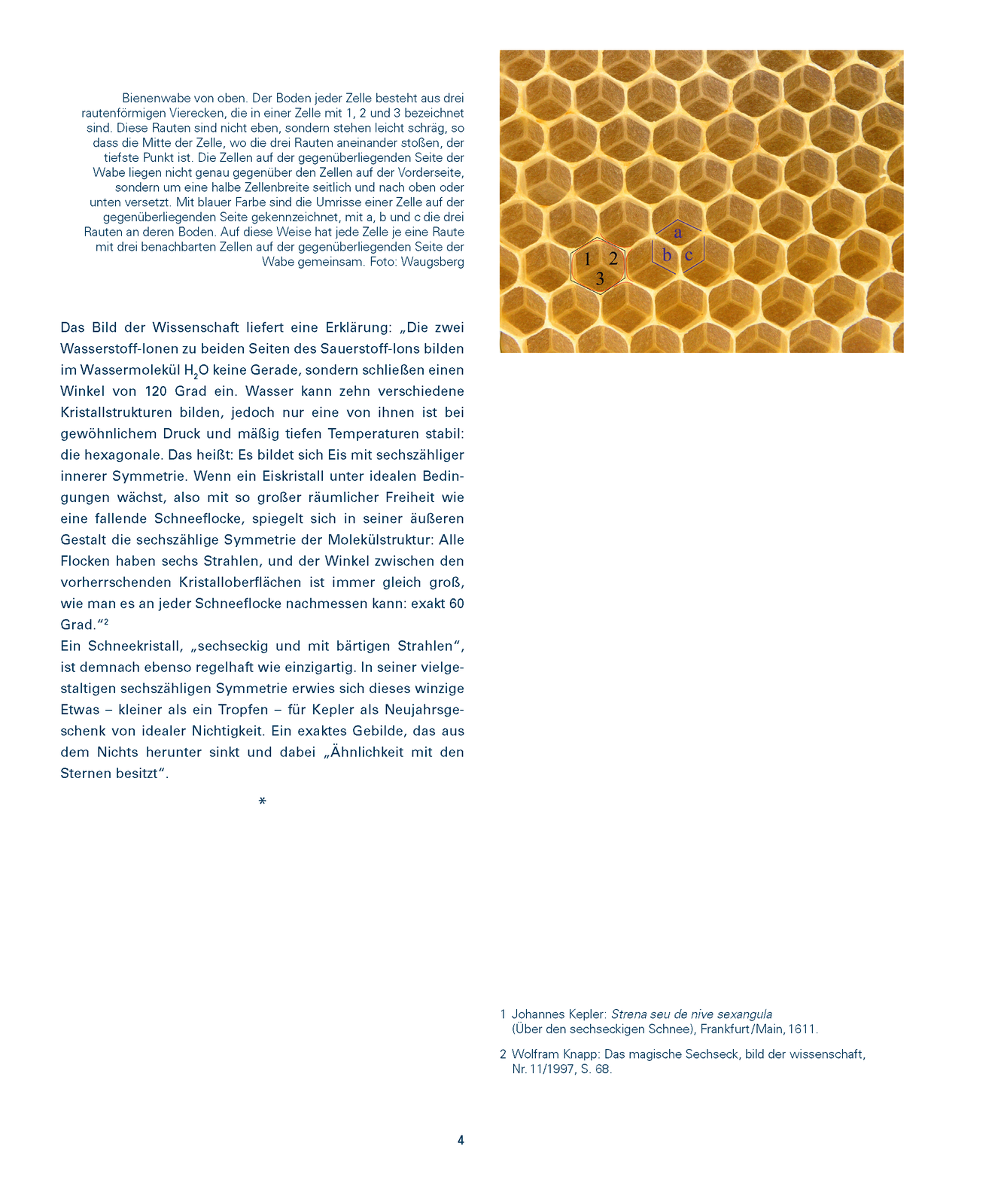 PublikationIn den letzten Tagen des Jahres 1610 kreisten die Gedanken des kaiserlichen Astronomen und Mathematikers Johannes Kepler um nichts. Während eines Winterspaziergangs, in Gedanken, mit welchem Neujahrsgeschenk er seinen Freund Johannes Matthäus Wackher von Wackhenfels – einen erklärten Liebhaber des Nichts – erfreuen könnte, waren ihm Schneeflocken auf den Mantel gefallen, „alle sechseckig und mit bärtigen Strahlen“. Die Verwunderung über die geometrische Vollkommenheit dieser winzigen Kristalle veranlasste ihn, einen Text zu verfassen mit dem Titel „Über den sechseckigen Schnee“ (Strena seu de nive sexangula). In der Annäherung an das Nichts übertraf die Flocke jede andere Wenigkeit, die als Neujahrsgabe in Frage gekommen wäre. Zum Beispiel das Staubkorn: „Es ist der Staub aber auch etwas Dauerhaftes, wenn er in den von Alter und vom Wurmstich zermürbten Balken herrscht. Ich würde also damit zuviel geben.“ Die Schneeflocke jedoch offenbart ihre sechszählige Symmetrie nur einen Moment lang, ehe sie mit anderen Kristallen verklumpt oder zum Wassertropfen schmilzt – ein Nichts, das sich in ein anderes verwandelt. In seinem Neujahrstext versucht Kepler die Ursache für das häufige Vorkommen der Sechseckform in der Natur zu ergründen, wobei das regelmäßige Hexagon der Bienenwabe eine zentrale Stelle einnimmt. .....