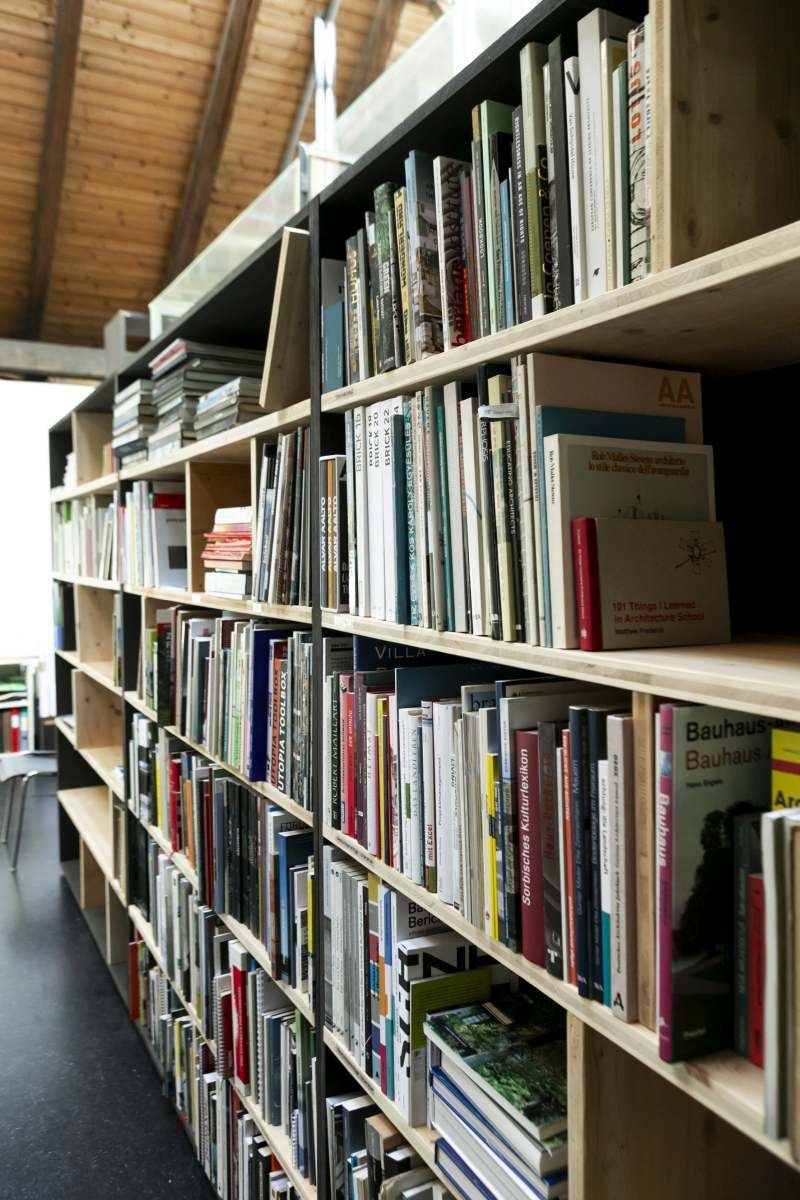 Die neuen Bücherregale wurden aus nicht mehr genutzten Platten und Beständen von bedruckten Ausstellungsmaterialien vom Architektur Haus Kärnten gebaut. Besonders die schwarz gefärbten MDF Platten der Ausstellung „Günther Domenig:DIMENSIONAL“ sind kreativ in Bücherregalen und dem mobilen Bücherturm verarbeitet.