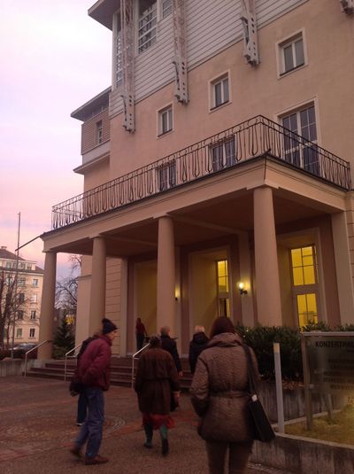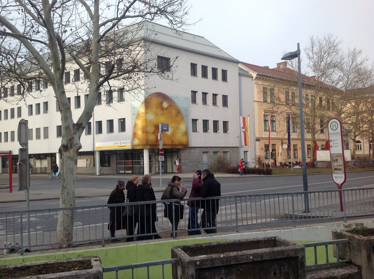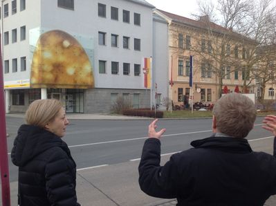 Wir machten uns gemeinsam auf den Weg durch Klagenfurt und entdeckten „Kunst am Bau“ im öffentlichen Raum. Startpunkt war die Eingangshalle im Hauptbahnhof Klagenfurt mit den bekannten Fresken von Giselbert Hoke. Über den Bahnhofsplatz, das Musil Literaturmuseum, das Landesarchiv, der WIMO, dem Verwaltungszentrum, dem Konzerthaus, der HTL und dem Amalienhof ging es Richtung Künstlerhaus und Architektur Haus Kärnten. Hier bot sich die Möglichkeit zum Besuch der Ausstellung „AUF DIE PLÄTZE – NA MESTA“.