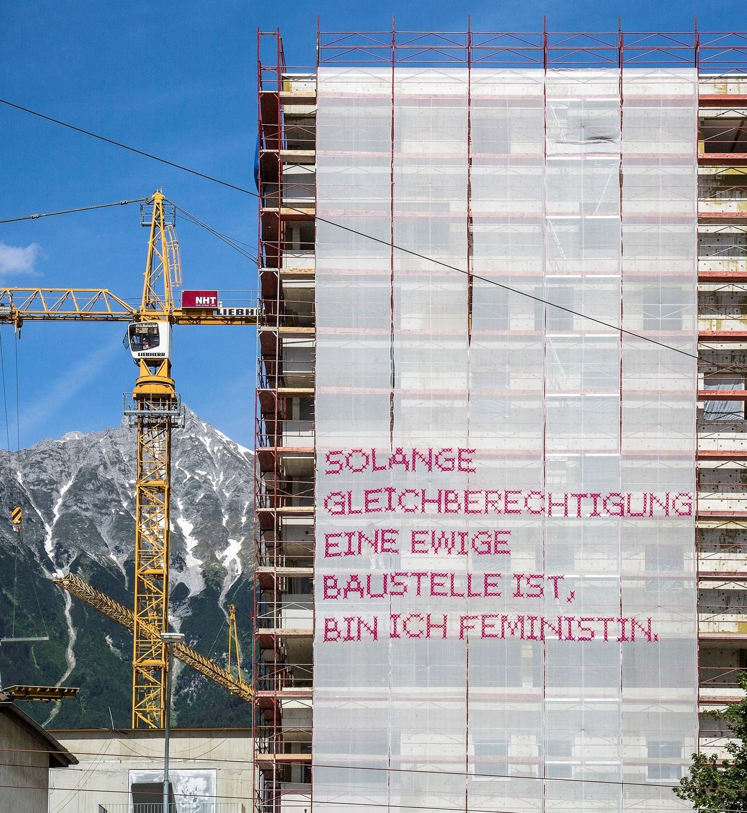 „Solange manche Herren glauben Gott zu sein, bin ich Feminist:in“, ist seit Mittwoch am Stadtpfarrturm in Klagenfurt, der gerade saniert wird, zu lesen. Die Installation ist eine weitere Ausgabe des feministischen „Solange“-Projekts von Katharina Cibulka. Dafür montiert die Künstlerin mit Kabelbindern und Tüll bestickte Staubschutznetze auf Baustellen. Um die Zweisprachigkeit sichtbar zu machen wurde der Satz in pink gestickten Versalien nicht nur auf Deutsch, sondern auch auf Slowenisch angebracht.