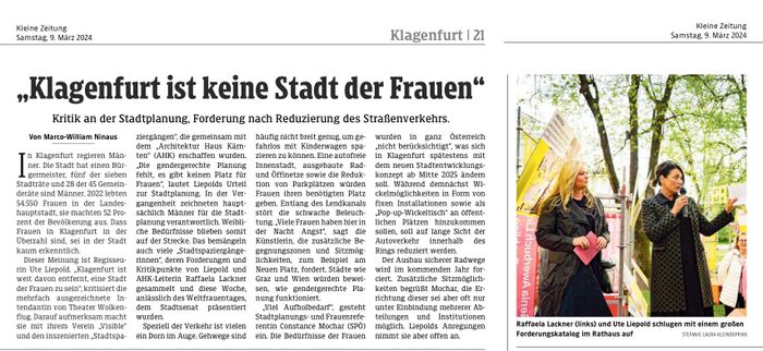 Dieser Meinung ist Regisseurin Ute Liepold. „Klagenfurt ist weit davon entfernt, eine Stadt der Frauen zu sein“, kritisiert die mehrfach ausgezeichnete Intendantin von Theater Wolkenflug. Darauf aufmerksam macht sie mit ihrem Verein „Visible“ und den inszenierten „Stadtspaziergängen“, die gemeinsam mit dem „Architektur Haus Kärnten“ (AHK) erschaffen wurden. „Die gendergerechte Planung fehlt, es gibt keinen Platz für Frauen“, lautet Liepolds Urteil zur Stadtplanung. In der Vergangenheit zeichneten hauptsächlich Männer für die Stadtplanung verantwortlich. Weibliche Bedürfnisse blieben somit auf der Strecke. Das bemängeln auch viele „Stadtspaziergängerinnen“, deren Forderungen und Kritikpunkte von Liepold und AHK-Leiterin Raffaela Lackner gesammelt und diese Woche, anlässlich des Weltfrauentages, dem Stadtsenat präsentiert wurden.
