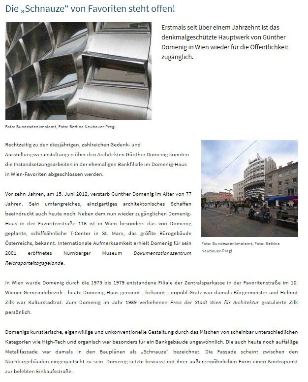 Vor zehn Jahren, am 15. Juni 2012, verstarb Günther Domenig im Alter von 77 Jahren. Sein umfangreiches, einzigartiges architektonisches Schaffen beeindruckt auch heute noch. Neben dem nun wieder zugänglichen Domenig-Haus in der Favoritenstraße 118 ist in Wien besonders das von Domenig geplante, schiffsähnliche T-Center in St. Marx, das größte Bürogebäude Österreichs, bekannt. Internationale Aufmerksamkeit erhielt Domenig für sein 2001 eröffnetes Nürnberger Museum Dokumentationszentrum Reichsparteitagsgelände.