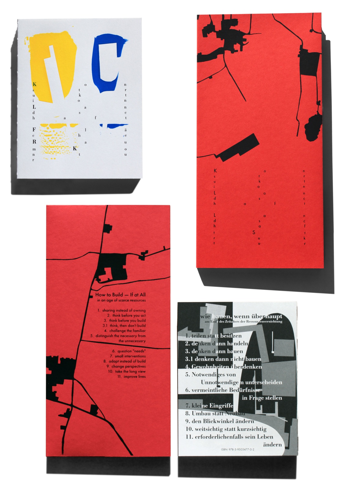 Jedes Exemplar des Buches „Konstruktion Landschaft, Fläche | Raum | Kontur“ hat einen individuellen Siebdruck am Cover (300 nummerierte Unikate), das Buch „Konstruktion Landschaft, Landschaft | Struktur“ ist von Hand geheftet, der Umschlag wurde im Siebdruckverfahren bedruckt.