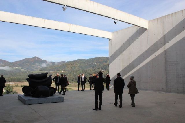 Wie eine Skulptur in der Landschaft ragt der langezogene Museumsbau auf einem stark abfallenden Hochplateau 70m über der Drau. Die Eingangszone orientiert sich zum Ortszentrum von Neuhaus und zum darüberliegenden historischen Schloss des Auftraggebers. Der Kern der Anlage ist die 160m lange tageslichtdurchflutete Ausstellungshalle mit angeschlossenen, großzügigen Terrassen und mobilen Trennwänden.