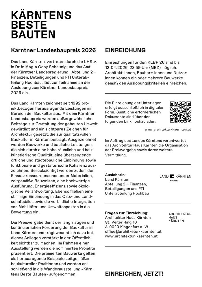 Einreichungen für den Kärntner Landesbaupreis 2026 sind bis 12.04.2026, 23.59 Uhr (MEZ) möglich. Architekt: innen, Bauherr: innen und Nutzer: innen sind berechtigt, ein oder mehrere Bauwerke - entsprechend der Auslobungskriterien - einzureichen. Die Einreichung erfolgt ausschließlich digital. Nach der Registrierung zum Kärntner Landesbaupreis 2026 sind alle erforderlichen Daten online zu erfassen und die Unterlagen hochzuladen. Nur vollständige Einreichungen können berücksichtigt werden. Alle hochgeladenen Daten lassen sich zwischenspeichern und in beliebig vielen Arbeitsschritten bis zum Ende der Einreichfrist bearbeiten.